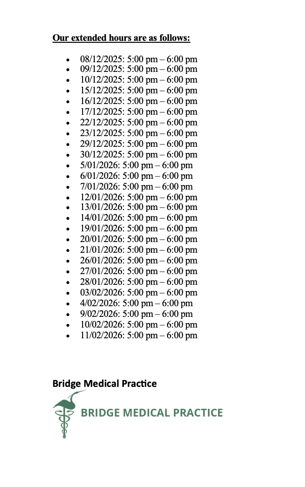 We would like to inform you that over the winter period, our Practice will be offering extended opening hours only for acute or respiratory-related issues. This is to ensure timely care during the higher-demand season.